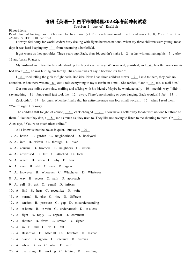 考研《英语一》四平市梨树县2023年考前冲刺试卷SectionIUseofEnglishDirections:Readthefollowingtext.Choosethebestword(s)foreachnumberedblankandmarkA,B,CorDontheANSWERSHEET.(10points)Ialwaysfeelsorryforworldleadersbusydealingwithfightsbetweennations.Whenmythreechildrenwereyoung,m