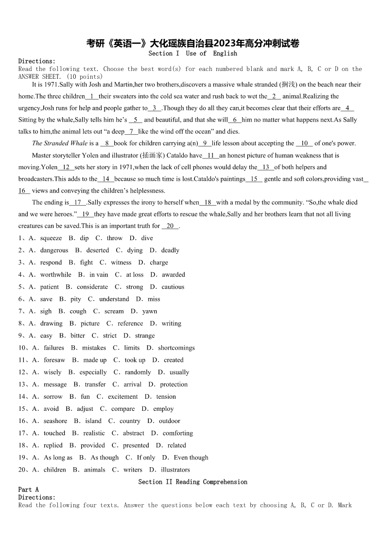 考研《英语一》大化瑶族自治县2023年高分冲刺试卷SectionIUseofEnglishDirections:Readthefollowingtext.Choosethebestword(s)foreachnumberedblankandmarkA,B,CorDontheANSWERSHEET.(10points)Itis1971.SallywithJoshandMartin,hertwobrothers,discoversamassivewhalestranded(搁浅)onthebeachneart