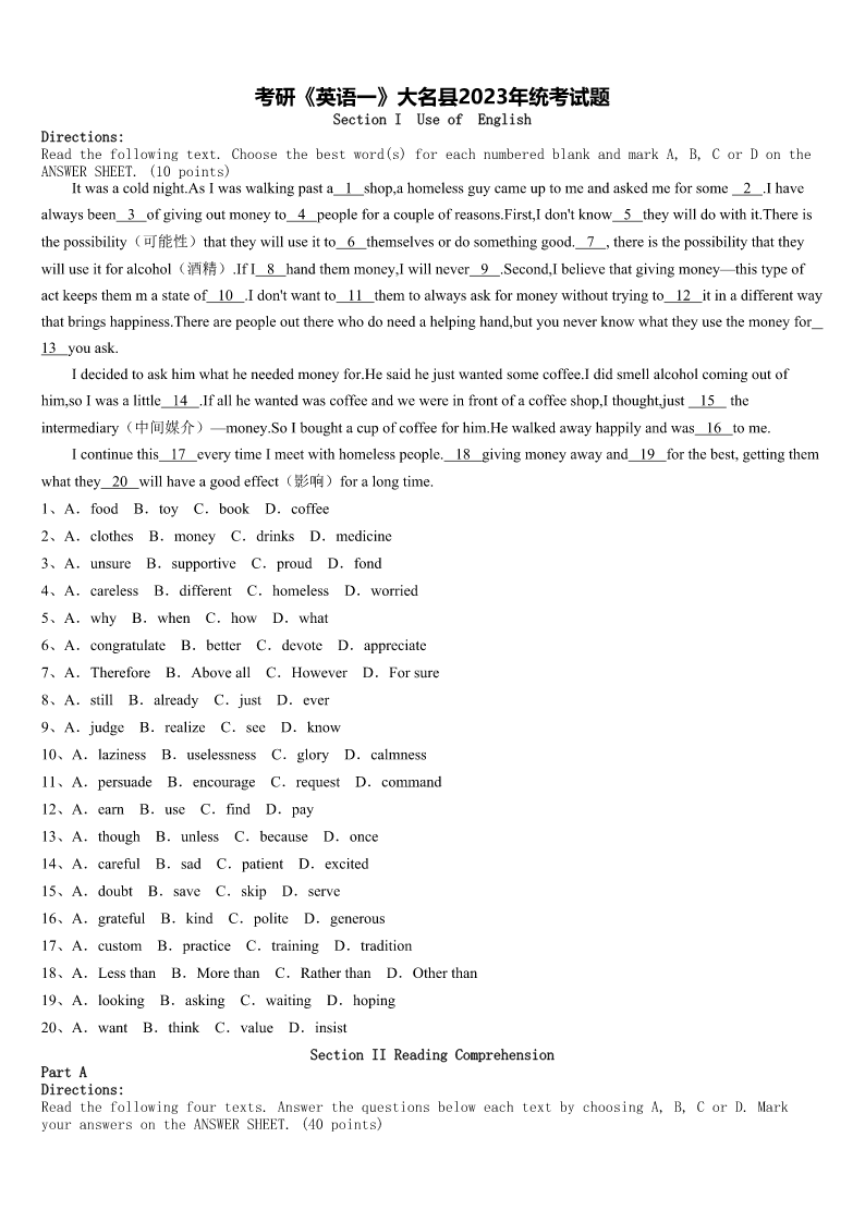 考研《英语一》大名县2023年统考试题SectionIUseofEnglishDirections:Readthefollowingtext.Choosethebestword(s)foreachnumberedblankandmarkA,B,CorDontheANSWERSHEET.(10points)Itwasacoldnight.AsIwaswalkingpasta1shop,ahomelessguycameuptomeandaskedmeforsome2.Ihavealwaysbeen3ofgiv