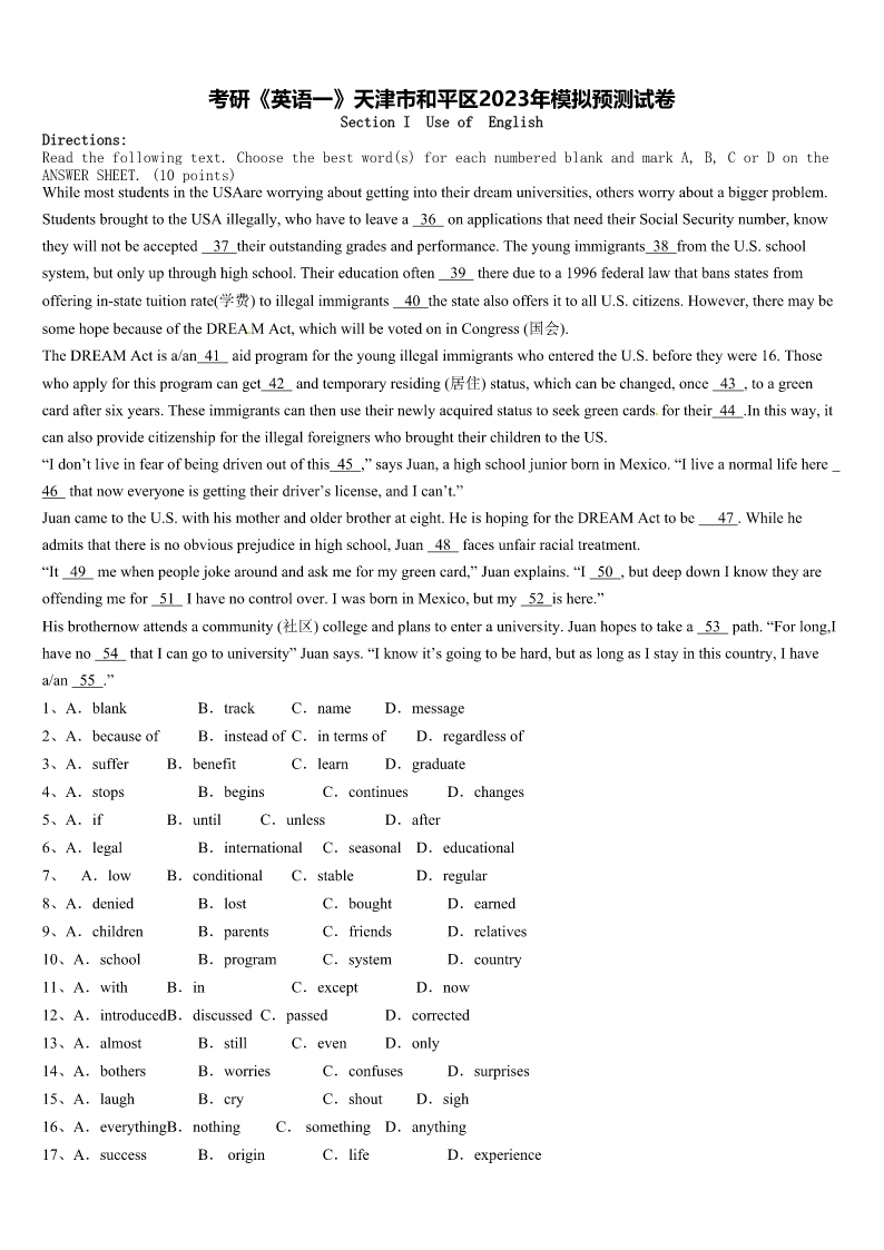 考研《英语一》天津市和平区2023年模拟预测试卷SectionIUseofEnglishDirections:Readthefollowingtext.Choosethebestword(s)foreachnumberedblankandmarkA,B,CorDontheANSWERSHEET.(10points)WhilemoststudentsintheUSAareworryingaboutgettingintotheirdreamuniversities,othersworryaboutabigge