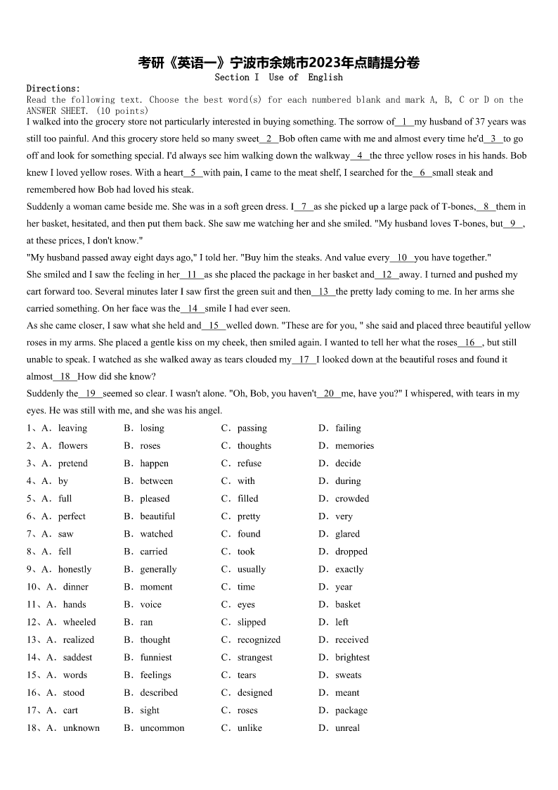 考研《英语一》宁波市余姚市2023年点睛提分卷SectionIUseofEnglishDirections:Readthefollowingtext.Choosethebestword(s)foreachnumberedblankandmarkA,B,CorDontheANSWERSHEET.(10points)Iwalkedintothegrocerystorenotparticularlyinterestedinbuyingsomething.Thesorrowof1myhusbandof37year
