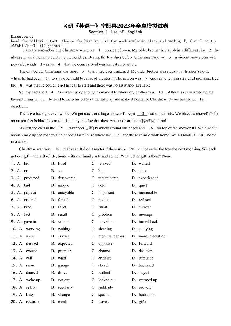 考研《英语一》宁阳县2023年全真模拟试卷SectionIUseofEnglishDirections:Readthefollowingtext.Choosethebestword(s)foreachnumberedblankandmarkA,B,CorDontheANSWERSHEET.(10points)IalwaysrememberoneChristmaswhenwe1outsideoftown.Myolderbrotherhadajobinadifferentcity2healwaysmadeit