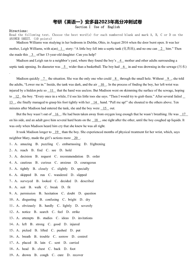 考研《英语一》安多县2023年高分冲刺试卷SectionIUseofEnglishDirections:Readthefollowingtext.Choosethebestword(s)foreachnumberedblankandmarkA,B,CorDontheANSWERSHEET.(10points)MadisonWilliamswasstudyinginherbedroominDublin,Ohio,inAugust2016whenthedoorburstopen.Itwashermother,