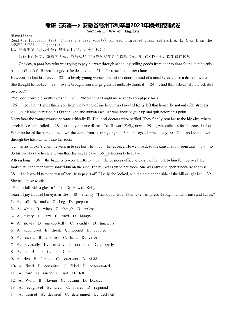 考研《英语一》安徽省亳州市利辛县2023年模拟预测试卷SectionIUseofEnglishDirections:Readthefollowingtext.Choosethebestword(s)foreachnumberedblankandmarkA,B,CorDontheANSWERSHEET.(10points)III.完形填空(共20小题;每小题1.5分),满分30分)阅读下面短文,掌握其大意,然后从3655各题所给的四个选项(A,B,C和D)中,选出最佳选项。Oneday,apoorboyw