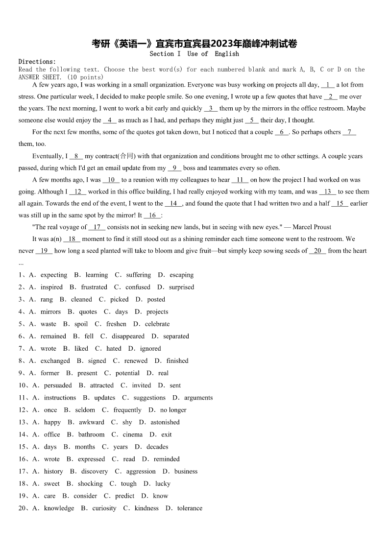 考研《英语一》宜宾市宜宾县2023年巅峰冲刺试卷SectionIUseofEnglishDirections:Readthefollowingtext.Choosethebestword(s)foreachnumberedblankandmarkA,B,CorDontheANSWERSHEET.(10points)Afewyearsago,Iwasworkinginasmallorganization.Everyonewasbusyworkingonprojectsallday,1alotfromstre