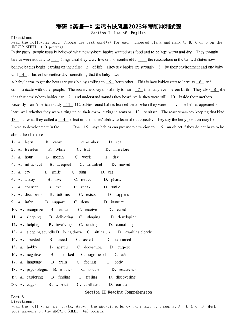 考研《英语一》宝鸡市扶风县2023年考前冲刺试题SectionIUseofEnglishDirections:Readthefollowingtext.Choosethebestword(s)foreachnumberedblankandmarkA,B,CorDontheANSWERSHEET.(10points)Inthepast,peopleusuallybelievedwhatnewlybornbabieswantedwasfoodandtobekeptwarmanddry.Theythought