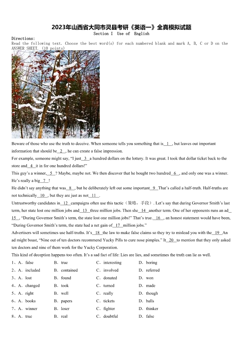 2023年山西省大同市灵县考研《英语一》全真模拟试题SectionIUseofEnglishDirections:Readthefollowingtext.Choosethebestword(s)foreachnumberedblankandmarkA,B,CorDontheANSWERSHEET.(10points)Bewareofthosewhousethetruthtodeceive.Whensomeonetellsyousomethingthatis1,butleavesoutimportanti
