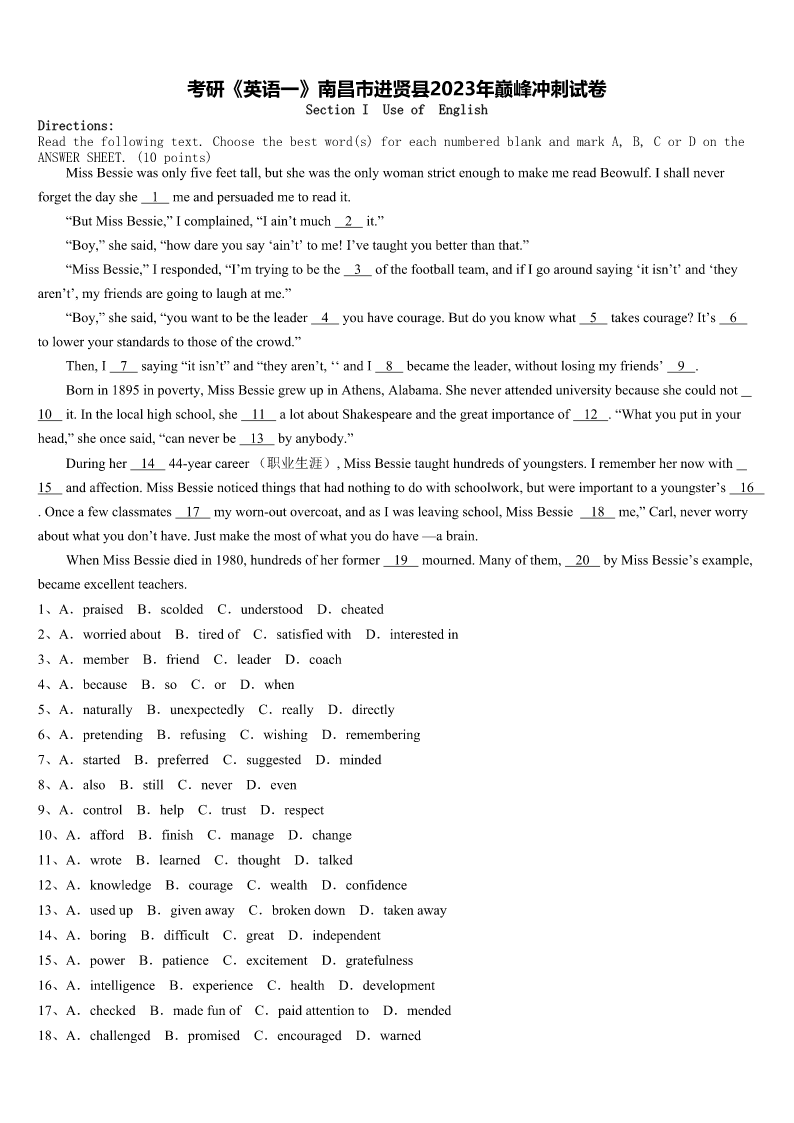 考研《英语一》南昌市进贤县2023年巅峰冲刺试卷SectionIUseofEnglishDirections:Readthefollowingtext.Choosethebestword(s)foreachnumberedblankandmarkA,B,CorDontheANSWERSHEET.(10points)MissBessiewasonlyfivefeettall,butshewastheonlywomanstrictenoughtomakemereadBeowulf.Ishallneverfor