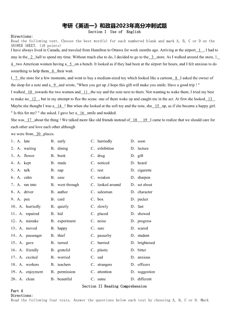 考研《英语一》和政县2023年高分冲刺试题SectionIUseofEnglishDirections:Readthefollowingtext.Choosethebestword(s)foreachnumberedblankandmarkA,B,CorDontheANSWERSHEET.(10points)IhavealwayslivedinCanada,andtraveledfromHamiltontoOttawaforworkmonthsago.Arrivingattheairport1,Ihadt