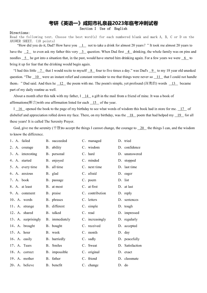 考研《英语一》咸阳市礼泉县2023年临考冲刺试卷SectionIUseofEnglishDirections:Readthefollowingtext.Choosethebestword(s)foreachnumberedblankandmarkA,B,CorDontheANSWERSHEET.(10points)“Howdidyoudoit,Dad?Howhaveyou1nottotakeadrinkforalmost20years?”Ittookmealmost20yearstohavethe2toe