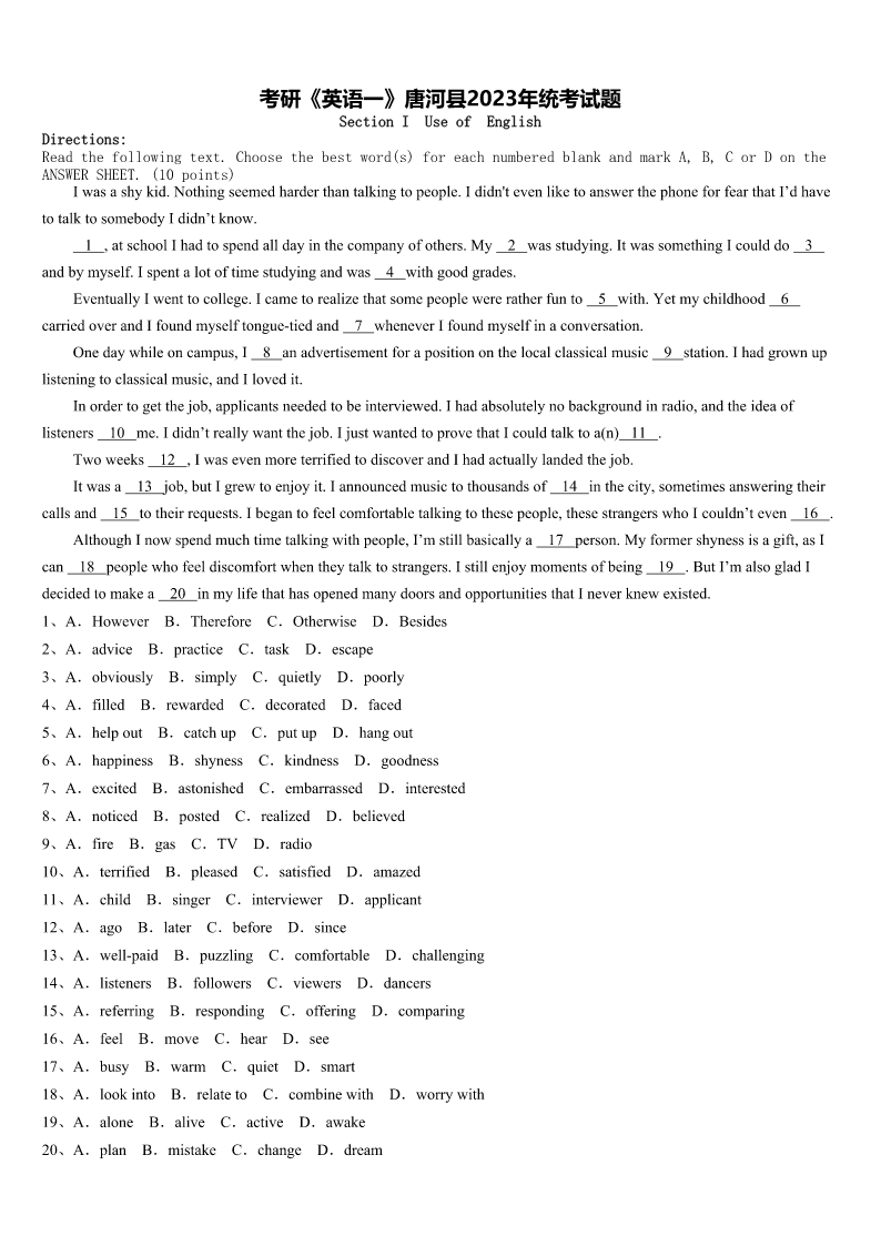 考研《英语一》唐河县2023年统考试题SectionIUseofEnglishDirections:Readthefollowingtext.Choosethebestword(s)foreachnumberedblankandmarkA,B,CorDontheANSWERSHEET.(10points)Iwasashykid.Nothingseemedharderthantalkingtopeople.Ididn'tevenliketoanswerthephoneforfearthatI’dhaveto