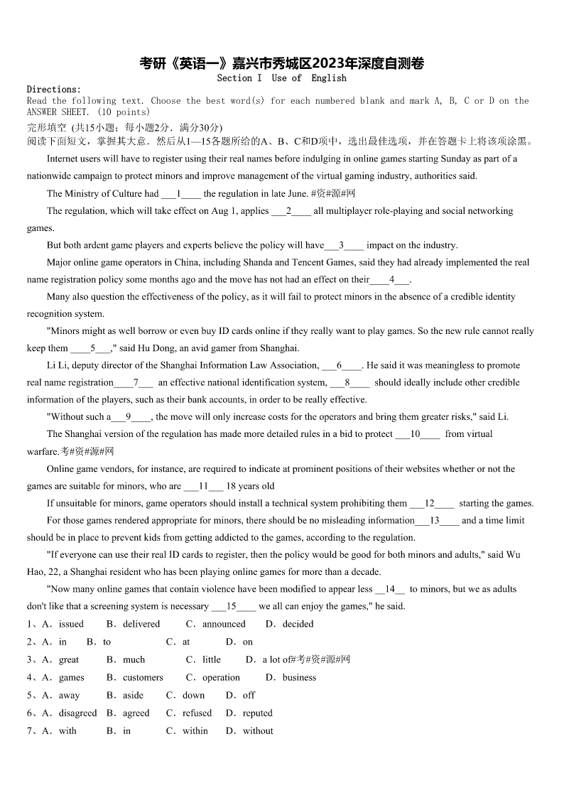 考研《英语一》嘉兴市秀城区2023年深度自测卷SectionIUseofEnglishDirections:Readthefollowingtext.Choosethebestword(s)foreachnumberedblankandmarkA,B,CorDontheANSWERSHEET.(10points)完形填空(共15小题;每小题2分.满分30分)阅读下面短文,掌握其大意.然后从1—15各题所给的A、B、C和D项中,选出最佳选项,并在答题卡上将该项涂黑。Internetuserswillhave
