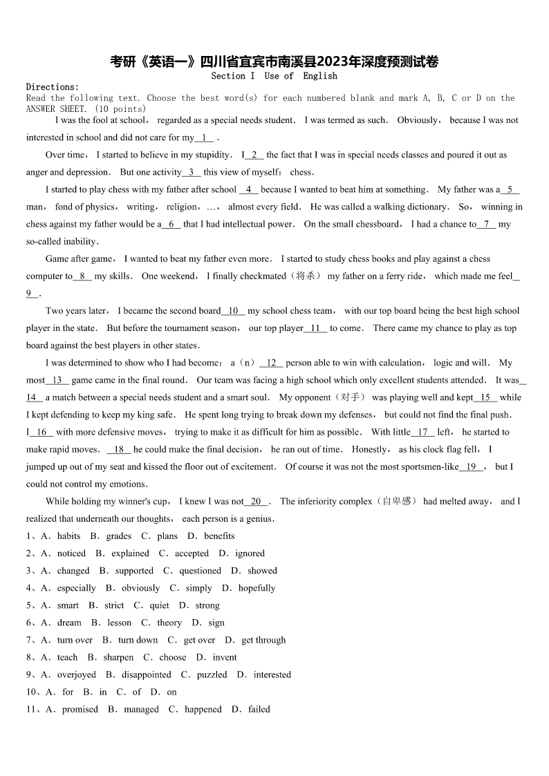 考研《英语一》四川省宜宾市南溪县2023年深度预测试卷SectionIUseofEnglishDirections:Readthefollowingtext.Choosethebestword(s)foreachnumberedblankandmarkA,B,CorDontheANSWERSHEET.(10points)Iwasthefoolatschool,regardedasaspecialneedsstudent.Iwastermedassuch.Obviously,becauseIwasnotin