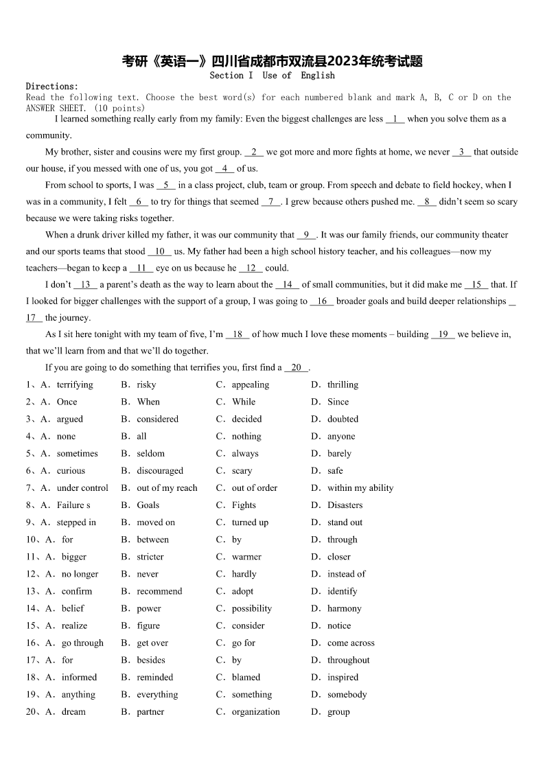 考研《英语一》四川省成都市双流县2023年统考试题SectionIUseofEnglishDirections:Readthefollowingtext.Choosethebestword(s)foreachnumberedblankandmarkA,B,CorDontheANSWERSHEET.(10points)Ilearnedsomethingreallyearlyfrommyfamily:Eventhebiggestchallengesareless1whenyousolvethemasacomm