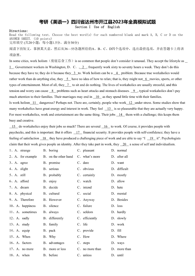 考研《英语一》四川省达州市开江县2023年全真模拟试题SectionIUseofEnglishDirections:Readthefollowingtext.Choosethebestword(s)foreachnumberedblankandmarkA,B,CorDontheANSWERSHEET.(10points)完形填空(共20小题;每小题1.5分,满分30分)阅读下面短文,掌握其大意,然后从36—55各题所给的A、B、C、D四个选项中,选出最佳选项,并在答题卡上将该项涂黑。Insomecitie