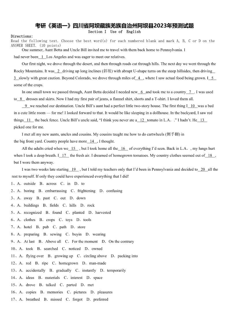 考研《英语一》四川省阿坝藏族羌族自治州阿坝县2023年预测试题SectionIUseofEnglishDirections:Readthefollowingtext.Choosethebestword(s)foreachnumberedblankandmarkA,B,CorDontheANSWERSHEET.(10points)Onesummer,AuntBettaandUncleBillinvitedmetotravelwiththembackhometoPennsylvania.Ihadneverbe
