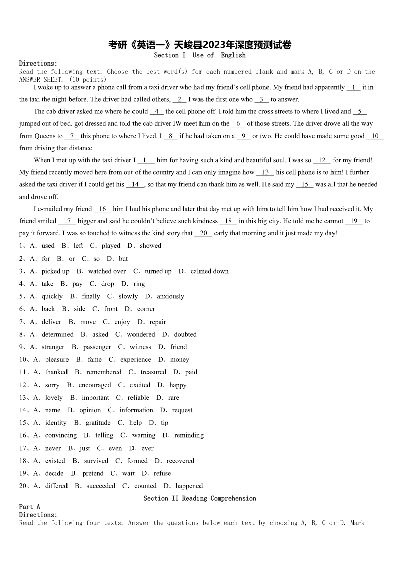 考研《英语一》天峻县2023年深度预测试卷SectionIUseofEnglishDirections:Readthefollowingtext.Choosethebestword(s)foreachnumberedblankandmarkA,B,CorDontheANSWERSHEET.(10points)Iwokeuptoansweraphonecallfromataxidriverwhohadmyfriend’scellphone.Myfriendhadapparently1itinthetaxit