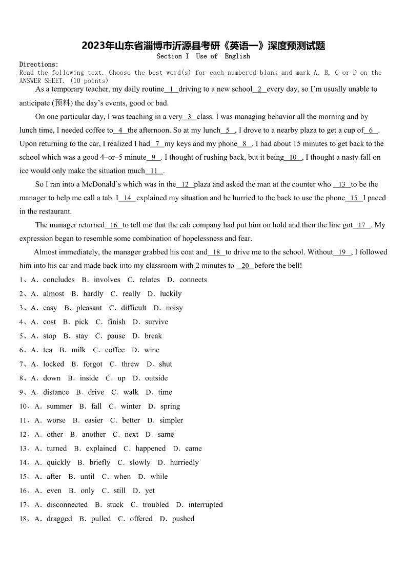 2023年山东省淄博市沂源县考研《英语一》深度预测试题SectionIUseofEnglishDirections:Readthefollowingtext.Choosethebestword(s)foreachnumberedblankandmarkA,B,CorDontheANSWERSHEET.(10points)Asatemporaryteacher,mydailyroutine1drivingtoanewschool2everyday,soI’musuallyunabletoanticipate