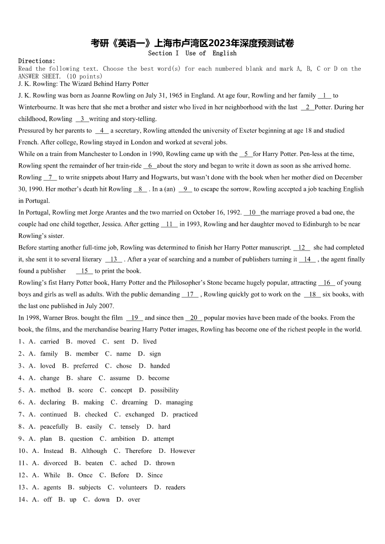 考研《英语一》上海市卢湾区2023年深度预测试卷SectionIUseofEnglishDirections:Readthefollowingtext.Choosethebestword(s)foreachnumberedblankandmarkA,B,CorDontheANSWERSHEET.(10points)J.K.Rowling:TheWizardBehindHarryPotterJ.K.RowlingwasbornasJoanneRowlingonJuly31,1965inEngland.Ata