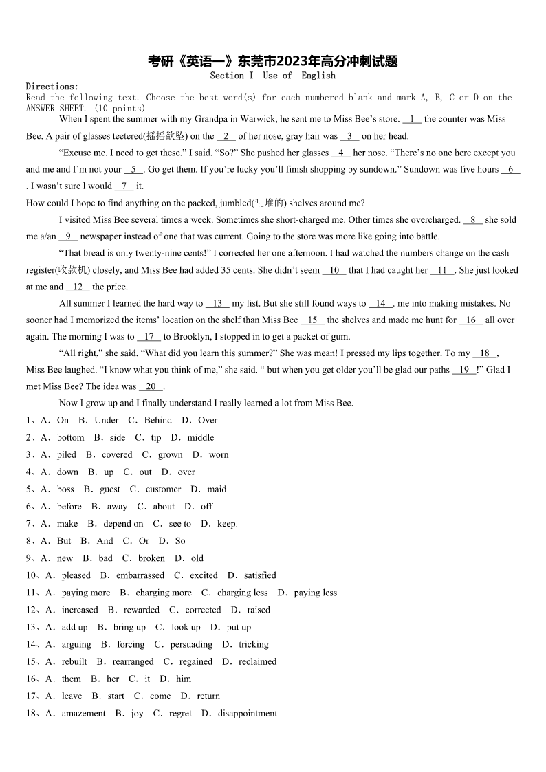 考研《英语一》东莞市2023年高分冲刺试题SectionIUseofEnglishDirections:Readthefollowingtext.Choosethebestword(s)foreachnumberedblankandmarkA,B,CorDontheANSWERSHEET.(10points)WhenIspentthesummerwithmyGrandpainWarwick,hesentmetoMissBee’sstore.1thecounterwasMissBee.Apairofglas