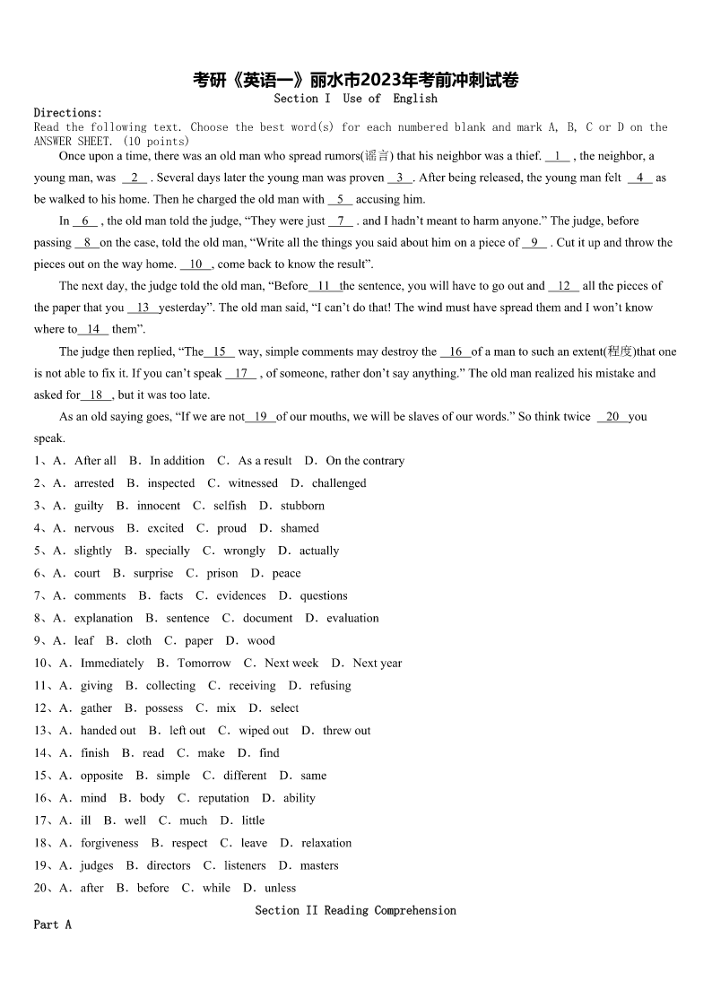 考研《英语一》丽水市2023年考前冲刺试卷SectionIUseofEnglishDirections:Readthefollowingtext.Choosethebestword(s)foreachnumberedblankandmarkA,B,CorDontheANSWERSHEET.(10points)Onceuponatime,therewasanoldmanwhospreadrumors(谣言)thathisneighborwasathief.1,theneighbor,ayoungman,wa