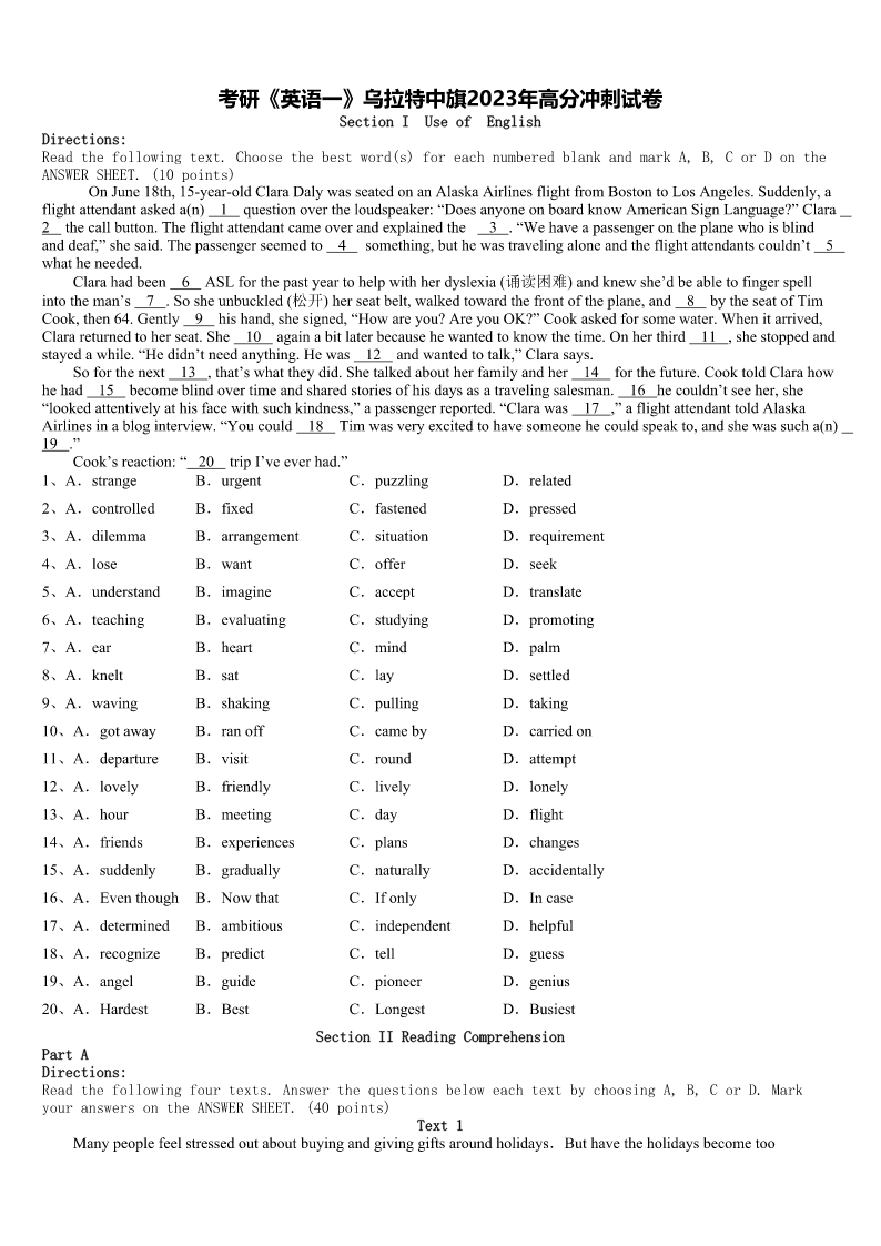 考研《英语一》乌拉特中旗2023年高分冲刺试卷SectionIUseofEnglishDirections:Readthefollowingtext.Choosethebestword(s)foreachnumberedblankandmarkA,B,CorDontheANSWERSHEET.(10points)OnJune18th,15-year-oldClaraDalywasseatedonanAlaskaAirlinesflightfromBostontoLosAngeles.Suddenly,af