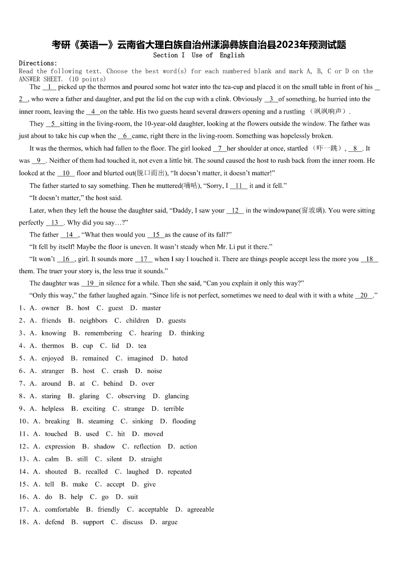 考研《英语一》云南省大理白族自治州漾濞彝族自治县2023年预测试题SectionIUseofEnglishDirections:Readthefollowingtext.Choosethebestword(s)foreachnumberedblankandmarkA,B,CorDontheANSWERSHEET.(10points)The1pickedupthethermosandpouredsomehotwaterintothetea-cupandplaceditonthesmalltableinfro