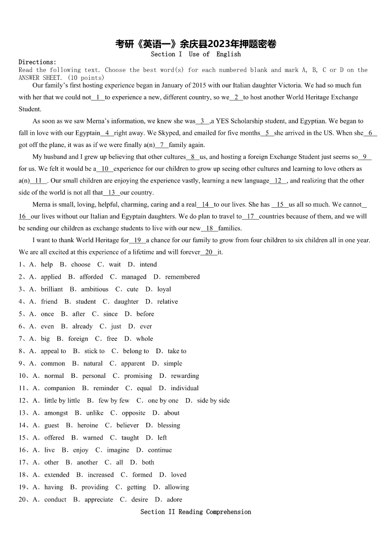 考研《英语一》余庆县2023年押题密卷SectionIUseofEnglishDirections:Readthefollowingtext.Choosethebestword(s)foreachnumberedblankandmarkA,B,CorDontheANSWERSHEET.(10points)Ourfamily’sfirsthostingexperiencebeganinJanuaryof2015withourItaliandaughterVictoria.Wehadsomuchfunwith