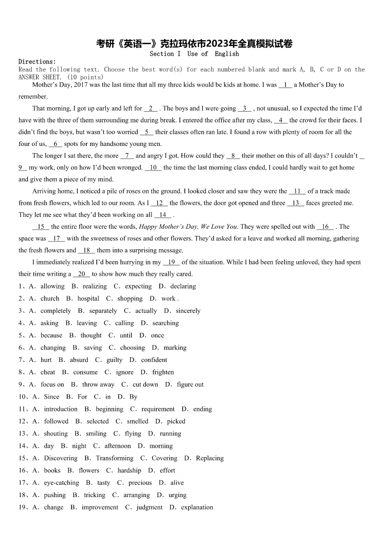 考研《英语一》克拉玛依市2023年全真模拟试卷SectionIUseofEnglishDirections:Readthefollowingtext.Choosethebestword(s)foreachnumberedblankandmarkA,B,CorDontheANSWERSHEET.(10points)Mother’sDay,2017wasthelasttimethatallmythreekidswouldbekidsathome.Iwas1aMother’sDaytoremember.That