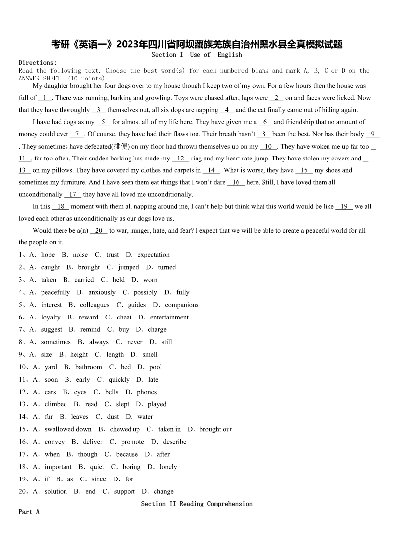 考研《英语一》2023年四川省阿坝藏族羌族自治州黑水县全真模拟试题SectionIUseofEnglishDirections:Readthefollowingtext.Choosethebestword(s)foreachnumberedblankandmarkA,B,CorDontheANSWERSHEET.(10points)MydaughterbroughtherfourdogsovertomyhousethoughIkeeptwoofmyown.Forafewhoursthenthehousew