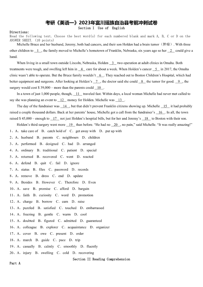考研《英语一》2023年富川瑶族自治县考前冲刺试卷SectionIUseofEnglishDirections:Readthefollowingtext.Choosethebestword(s)foreachnumberedblankandmarkA,B,CorDontheANSWERSHEET.(10points)MichelleBruceandherhusband,Jeremy,bothhadcancers,andtheirsonHoldenhadabraintumor(肿瘤).Withthreeot
