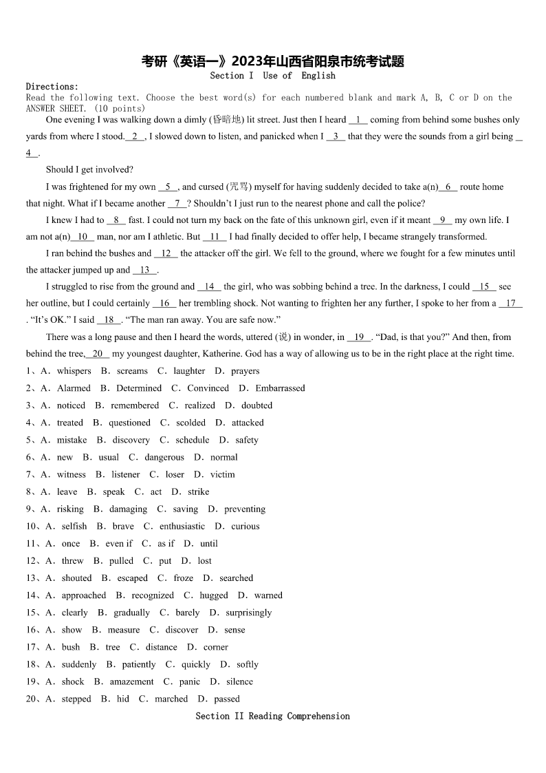 考研《英语一》2023年山西省阳泉市统考试题SectionIUseofEnglishDirections:Readthefollowingtext.Choosethebestword(s)foreachnumberedblankandmarkA,B,CorDontheANSWERSHEET.(10points)OneeveningIwaswalkingdownadimly(昏暗地)litstreet.JustthenIheard1comingfrombehindsomebushesonlyyardsfro