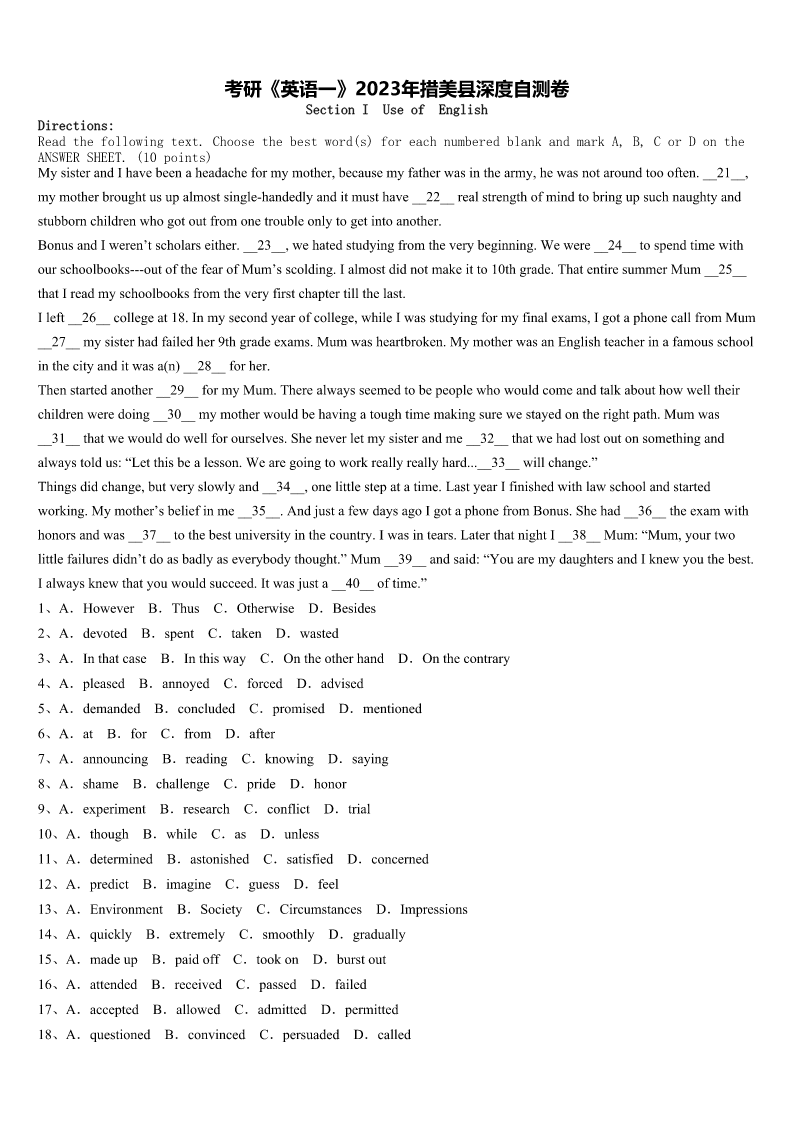 考研《英语一》2023年措美县深度自测卷SectionIUseofEnglishDirections:Readthefollowingtext.Choosethebestword(s)foreachnumberedblankandmarkA,B,CorDontheANSWERSHEET.(10points)MysisterandIhavebeenaheadacheformymother,becausemyfatherwasinthearmy,hewasnotaroundtoooften.__21__,my