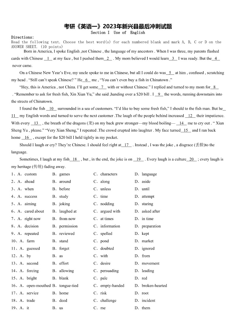 考研《英语一》2023年新兴县最后冲刺试题SectionIUseofEnglishDirections:Readthefollowingtext.Choosethebestword(s)foreachnumberedblankandmarkA,B,CorDontheANSWERSHEET.(10points)BorninAmerica,IspokeEnglish,notChinese,thelanguageofmyancestors.WhenIwasthree,myparentsflashedcardsw