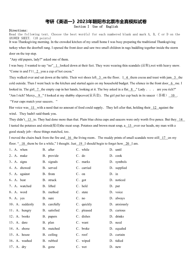 考研《英语一》2023年朝阳市北票市全真模拟试卷SectionIUseofEnglishDirections:Readthefollowingtext.Choosethebestword(s)foreachnumberedblankandmarkA,B,CorDontheANSWERSHEET.(10points)ItwasThanksgivingmorning.InthecrowdedkitchenofmysmallhomeIwasbusypreparingthetraditionalThanksgiv