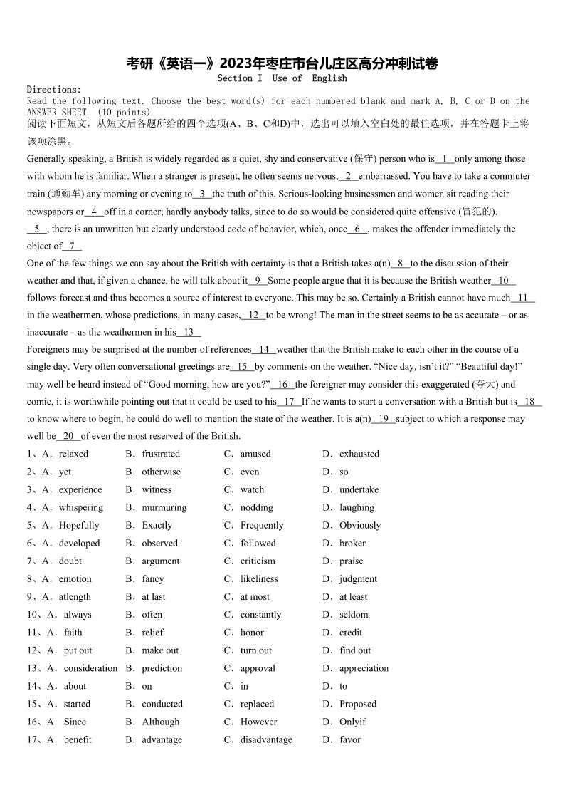 考研《英语一》2023年枣庄市台儿庄区高分冲刺试卷SectionIUseofEnglishDirections:Readthefollowingtext.Choosethebestword(s)foreachnumberedblankandmarkA,B,CorDontheANSWERSHEET.(10points)阅读下面短文,从短文后各题所给的四个选项(A、B、C和D)中,选出可以填入空白处的最佳选项,并在答题卡上将该项涂黑。Generallyspeaking,aBritishiswidelyrega