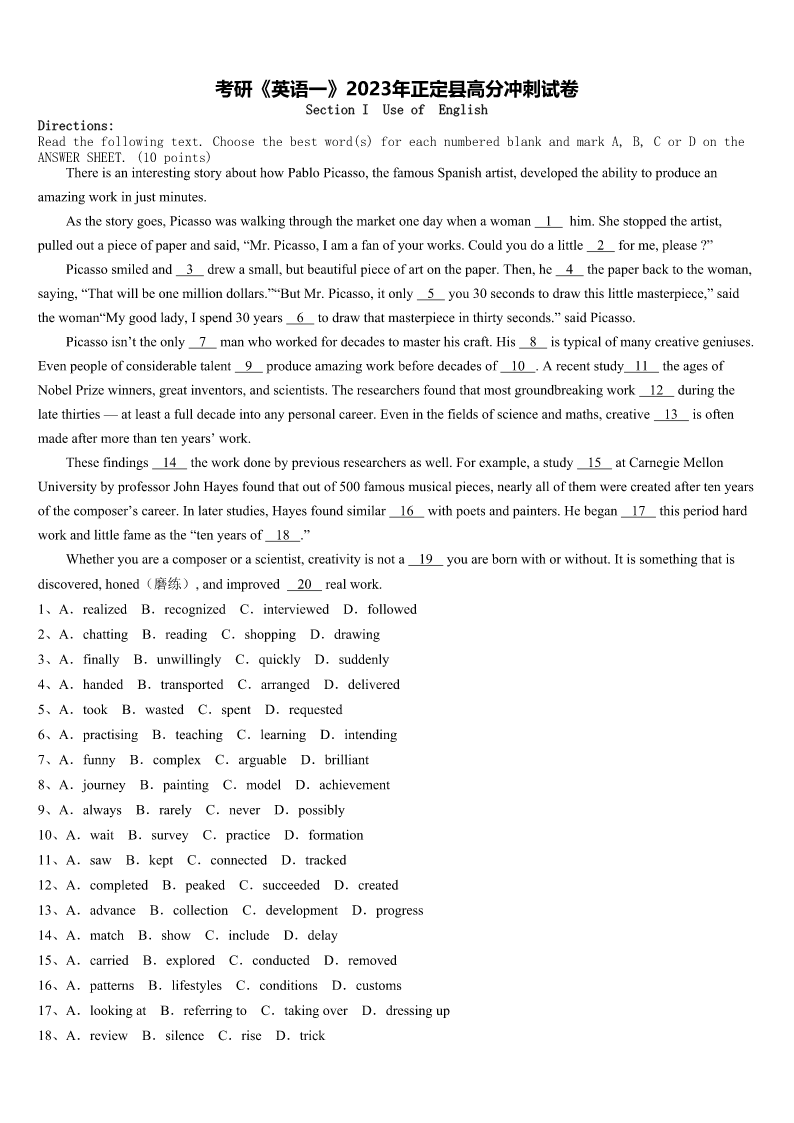 考研《英语一》2023年正定县高分冲刺试卷SectionIUseofEnglishDirections:Readthefollowingtext.Choosethebestword(s)foreachnumberedblankandmarkA,B,CorDontheANSWERSHEET.(10points)ThereisaninterestingstoryabouthowPabloPicasso,thefamousSpanishartist,developedtheabilitytoproduceana