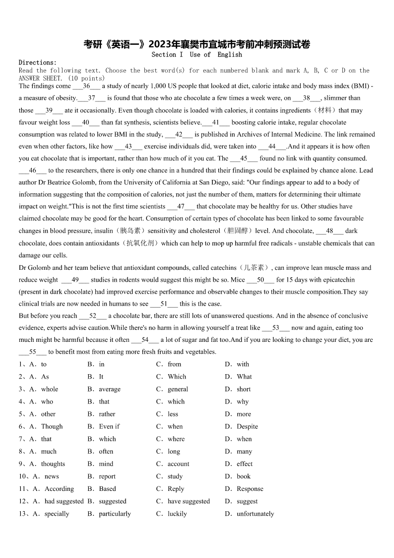 考研《英语一》2023年襄樊市宜城市考前冲刺预测试卷SectionIUseofEnglishDirections:Readthefollowingtext.Choosethebestword(s)foreachnumberedblankandmarkA,B,CorDontheANSWERSHEET.(10points)Thefindingscome___36___astudyofnearly1,000USpeoplethatlookedatdiet,calorieintakeandbodymassinde