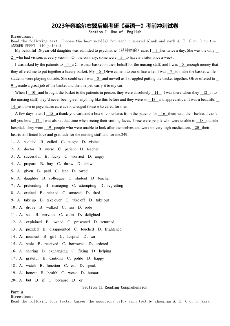 2023年察哈尔右翼后旗考研《英语一》考前冲刺试卷SectionIUseofEnglishDirections:Readthefollowingtext.Choosethebestword(s)foreachnumberedblankandmarkA,B,CorDontheANSWERSHEET.(10points)Mybeautiful18-year-olddaughterwasadmittedtopsychiatric(精神病的)care.I1hertwiceaday.Shewastheonly2wh