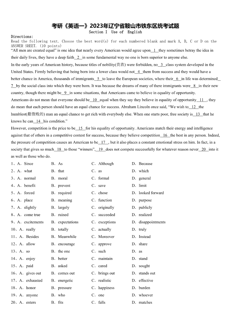 考研《英语一》2023年辽宁省鞍山市铁东区统考试题SectionIUseofEnglishDirections:Readthefollowingtext.Choosethebestword(s)foreachnumberedblankandmarkA,B,CorDontheANSWERSHEET.(10points)“Allmenarecreatedequal”isoneideathatnearlyeveryAmericanwouldagreeupon1theysometimesbetraytheidea