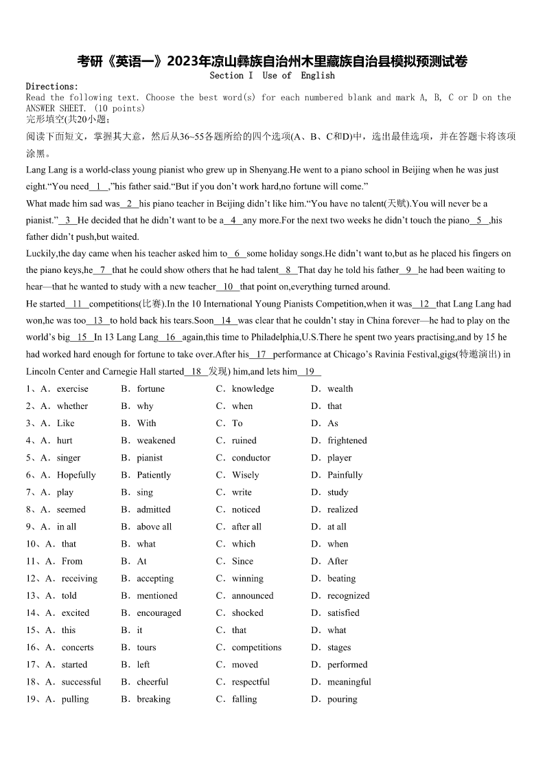 考研《英语一》2023年凉山彝族自治州木里藏族自治县模拟预测试卷SectionIUseofEnglishDirections:Readthefollowingtext.Choosethebestword(s)foreachnumberedblankandmarkA,B,CorDontheANSWERSHEET.(10points)完形填空(共20小题;阅读下面短文,掌握其大意,然后从36~55各题所给的四个选项(A、B、C和D)中,选出最佳选项,并在答题卡将该项涂黑。LangLangisaworld-cl