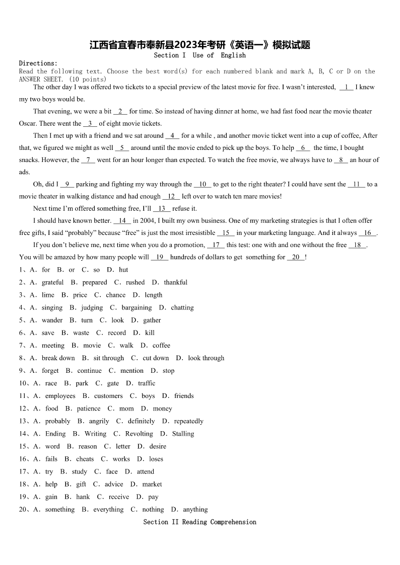 江西省宜春市奉新县2023年考研《英语一》模拟试题SectionIUseofEnglishDirections:Readthefollowingtext.Choosethebestword(s)foreachnumberedblankandmarkA,B,CorDontheANSWERSHEET.(10points)TheotherdayIwasofferedtwoticketstoaspecialpreviewofthelatestmovieforfree.Iwasn’tinterested,1Ikne