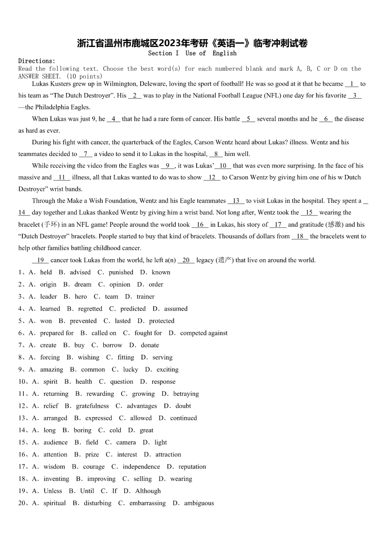 浙江省温州市鹿城区2023年考研《英语一》临考冲刺试卷SectionIUseofEnglishDirections:Readthefollowingtext.Choosethebestword(s)foreachnumberedblankandmarkA,B,CorDontheANSWERSHEET.(10points)LukasKustersgrewupinWilmington,Deleware,lovingthesportoffootball!Hewassogoodatitthathebecame1t