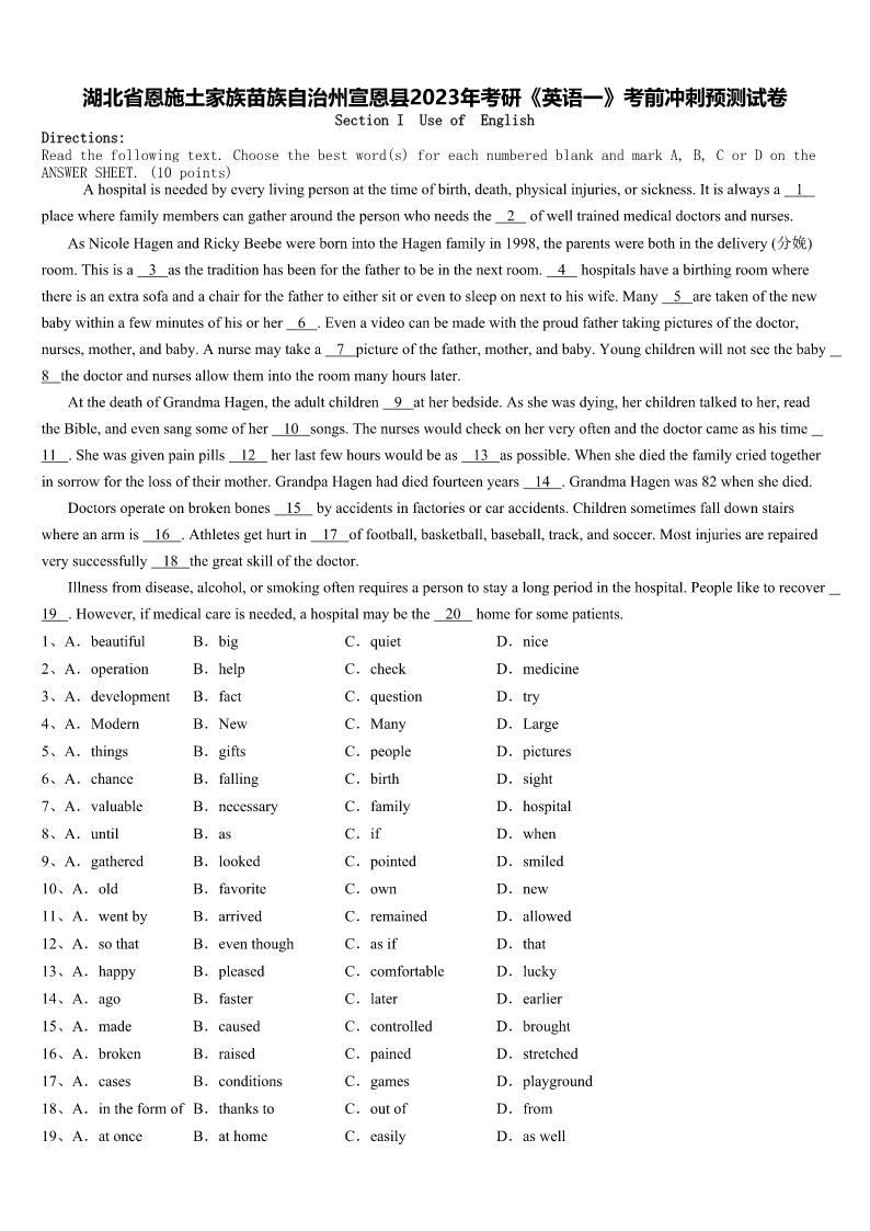 湖北省恩施土家族苗族自治州宣恩县2023年考研《英语一》考前冲刺预测试卷SectionIUseofEnglishDirections:Readthefollowingtext.Choosethebestword(s)foreachnumberedblankandmarkA,B,CorDontheANSWERSHEET.(10points)Ahospitalisneededbyeverylivingpersonatthetimeofbirth,death,physicalinjuries,orsicknes