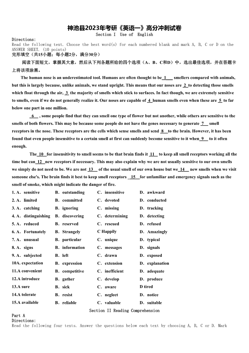 神池县2023年考研《英语一》高分冲刺试卷SectionIUseofEnglishDirections:Readthefollowingtext.Choosethebestword(s)foreachnumberedblankandmarkA,B,CorDontheANSWERSHEET.(10points)完形填空(共15小题;每小题2分,满分30分)阅读下面短文,掌握其大意,然后从下列各题所给的四个选项(A、B、C和D)中,选出最佳选项,并在答题卡上将该项涂黑。Thehumannoseisanunde