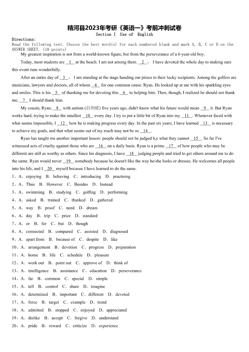 精河县2023年考研《英语一》考前冲刺试卷SectionIUseofEnglishDirections:Readthefollowingtext.Choosethebestword(s)foreachnumberedblankandmarkA,B,CorDontheANSWERSHEET.(10points)Mygreatestinspirationisnotfromaworldknownfigure,butfromtheperseveranceofa6yearoldboy.Today,mostst