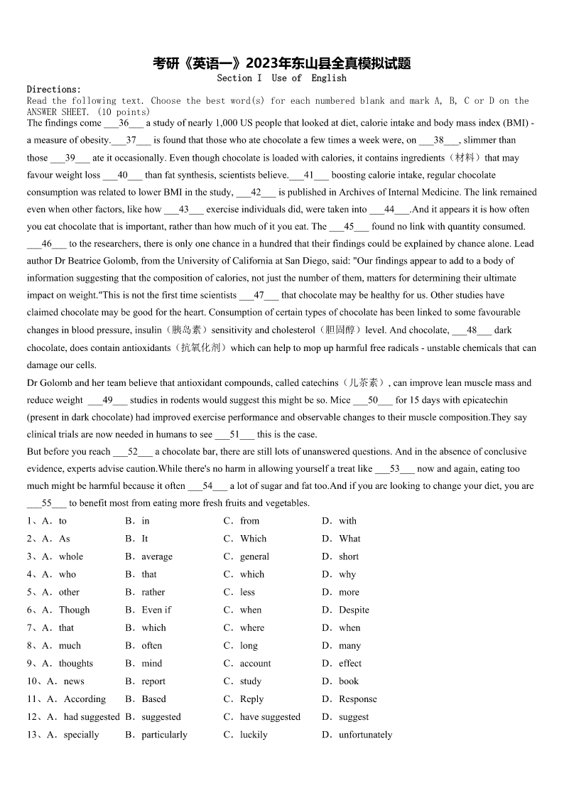 考研《英语一》2023年东山县全真模拟试题SectionIUseofEnglishDirections:Readthefollowingtext.Choosethebestword(s)foreachnumberedblankandmarkA,B,CorDontheANSWERSHEET.(10points)Thefindingscome___36___astudyofnearly1,000USpeoplethatlookedatdiet,calorieintakeandbodymassindex(BMI