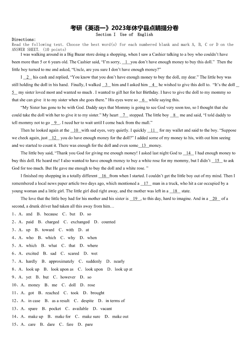 考研《英语一》2023年休宁县点睛提分卷SectionIUseofEnglishDirections:Readthefollowingtext.Choosethebestword(s)foreachnumberedblankandmarkA,B,CorDontheANSWERSHEET.(10points)IwaswalkingaroundinaBigBazarstoredoingashopping,whenIsawaCashiertalkingtoaboywhocouldn’thavebeenmoret