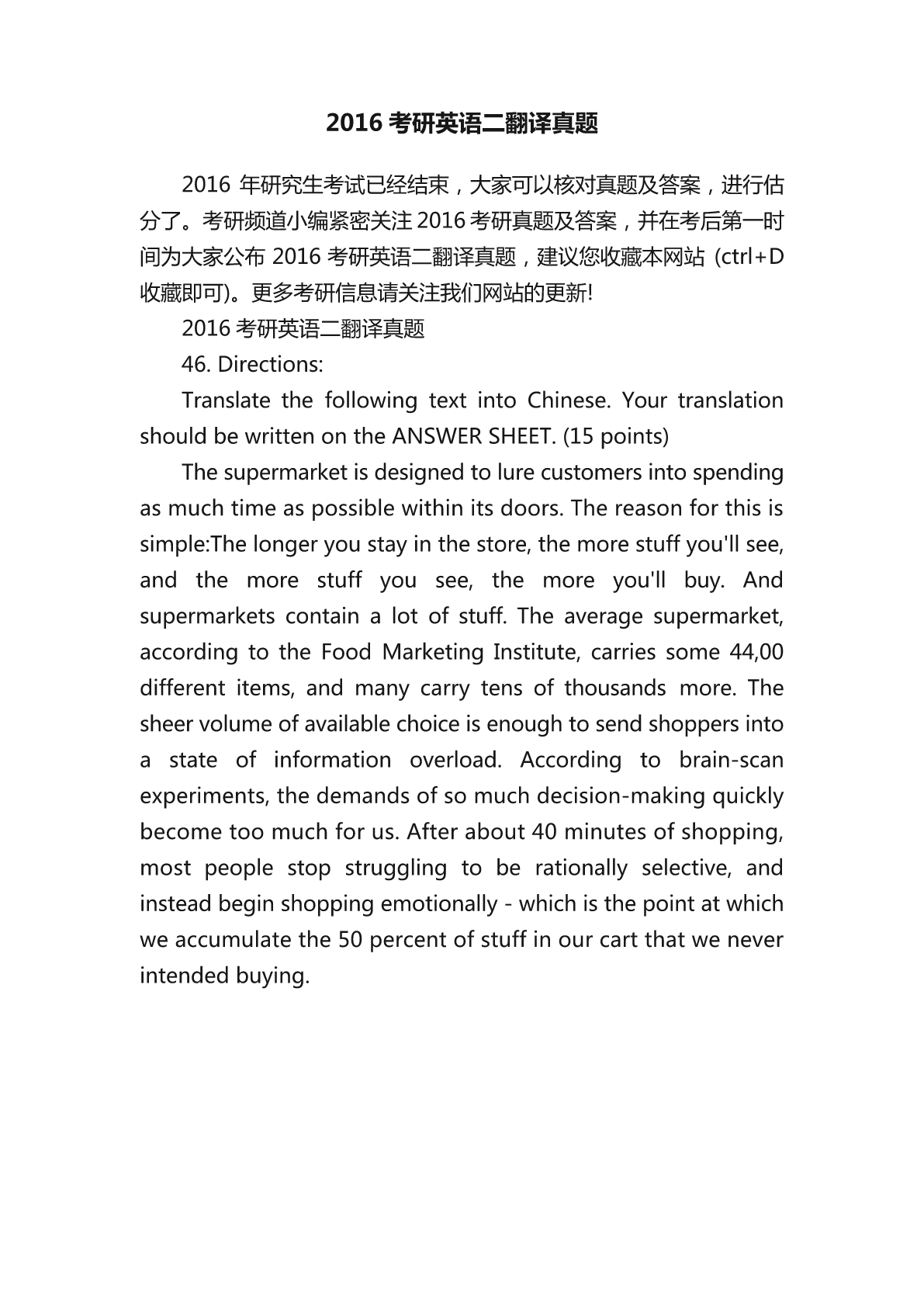 2016考研英语二翻译真题2016年研究生考试已经结束,大家可以核对真题及答案,进行估分了。考研频道小编紧密关注2016考研真题及答案,并在考后第一时间为大家公布2016考研英语二翻译真题,建议您收藏本网站(ctrl+D收藏即可)。更多考研信息请关注我们网站的更新!2016考研英语二翻译真题46.Directions:TranslatethefollowingtextintoChinese.YourtranslationshouldbewrittenontheANSWERSHEET.(15points)T