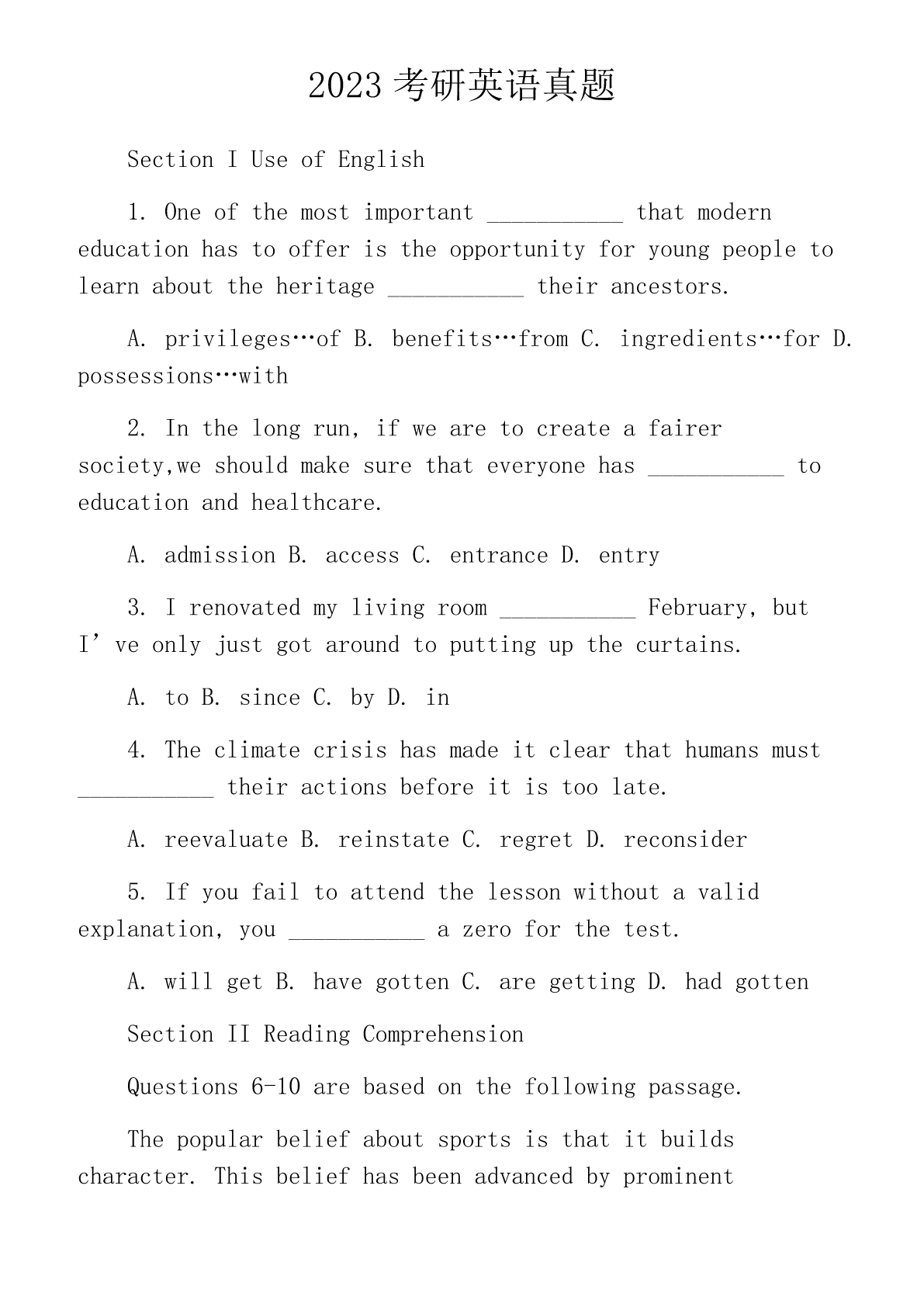 2023考研英语真题SectionIUseofEnglish1.Oneofthemostimportant___________thatmoderneducationhastoofferistheopportunityforyoungpeopletolearnabouttheheritage___________theirancestors.A.privileges…ofB.benefits…fromC.ingredients…forD.possessions…with2.Inthelongrun,ifw